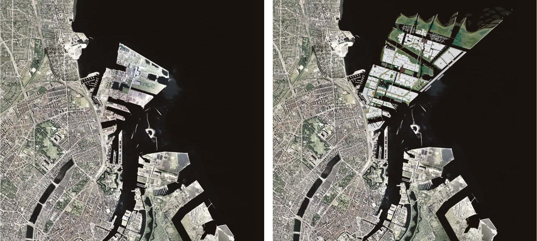 Nordhavn as it looked before the extension began in 2008 (left) and Nordhavn as it will look when fully expanded (right). (Source: cobe.dk)
