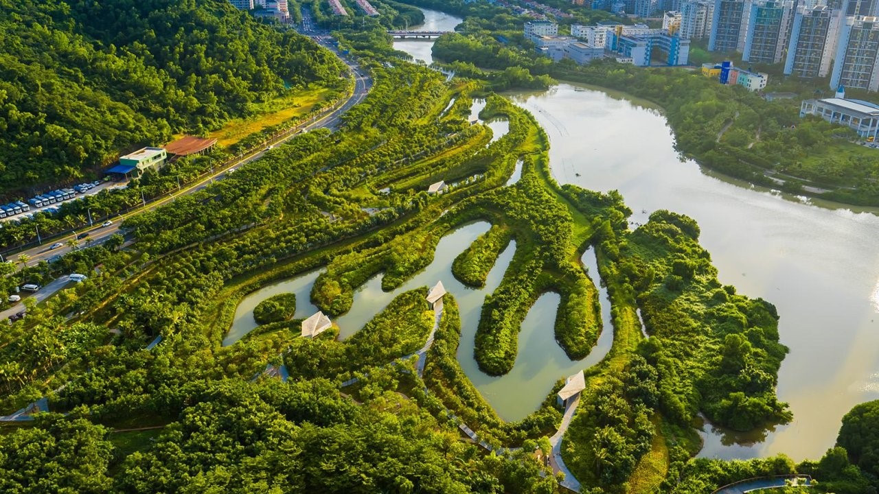 Yanweizhou Park in Jinhua City A sponge city is a city that’s “designed to passively absorb, clean and use rainfall in an ecologically friendly way that reduces dangerous and polluted runoff”, and leverage techniques such as permeable roads, rooftop gardens, rainwater harvesting, green space and more. Source: turenscape.com