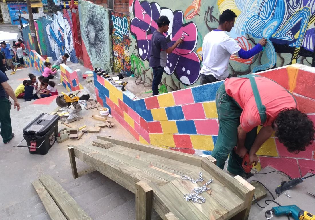 In Jardim Nakamura, local youth used Minecraft in a Block by Block workshop to redesign a deteriorated public staircase. Their ideas included plants, seating, art, trash cans, games, and a library; the built result became a playful mini-park with murals, benches, a community library, and a slide, and the project says use of the staircase increased after the safety and design improvements. This is a particularly valuable example for landscape architects because the “game” was used as a co-design tool, not just as an end-user attraction.