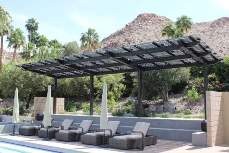 - Shaded PV canopies integrate solar panels into pergolas, dining areas, and pool pavilions, generating clean energy while providing shade. When connected to battery storage systems, these can power landscape lighting and other amenities at night.