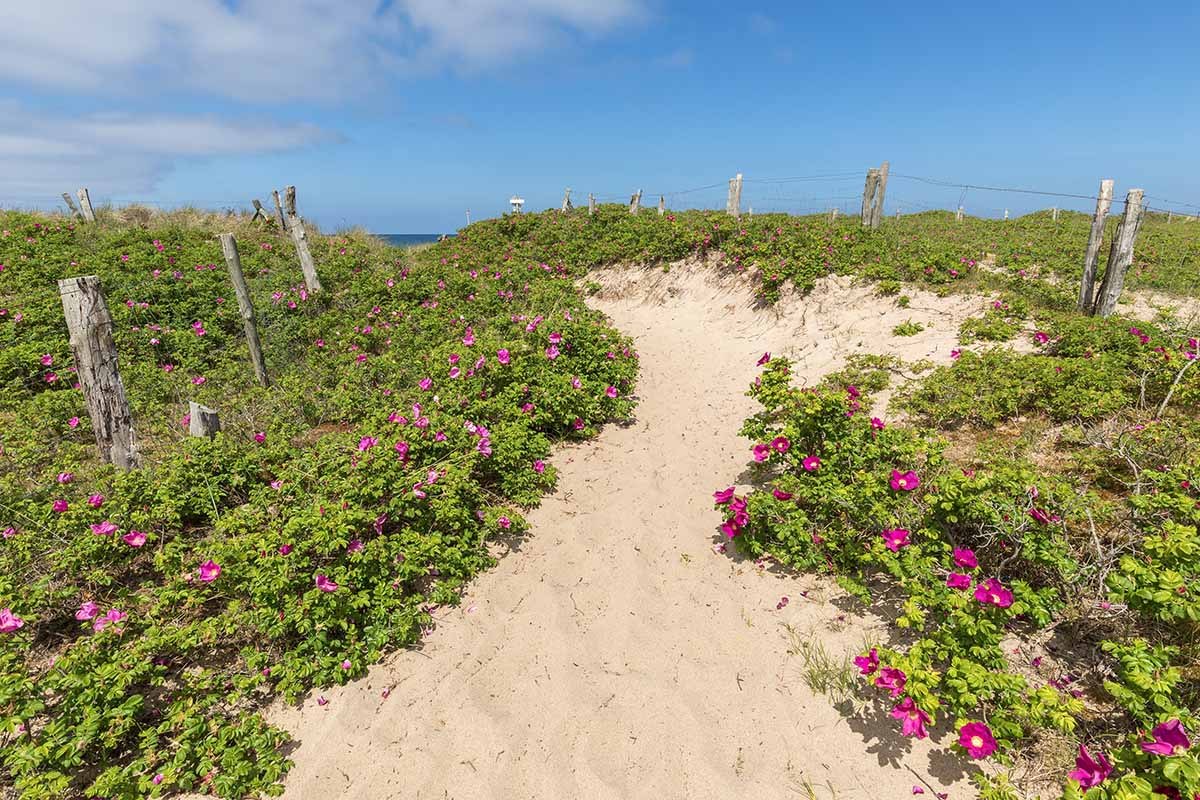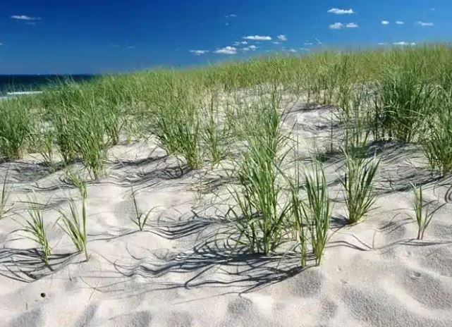 On dunes and foredunes, American beachgrass (Ammophila breviligulata) remains the workhorse. It is a strongly rhizomatous grass, typically rated hardy between zones 3 and 8, capable of spreading 6–10 feet per year under shifting sand. It tolerates drought, intense sun and burial by up to 30 cm of sand per year, which makes it ideal as a first stabiliser of active dunes.