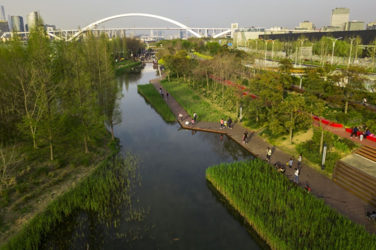 Houtan Park on Shanghai’s Huangpu River, designed by Turenscape, takes a different but equally instructive approach. Built on a narrow strip of former industrial land, the park uses terraced wetlands, floodable promenades and reclaimed materials to create a landscape that both treats polluted river water and accommodates regular flooding.