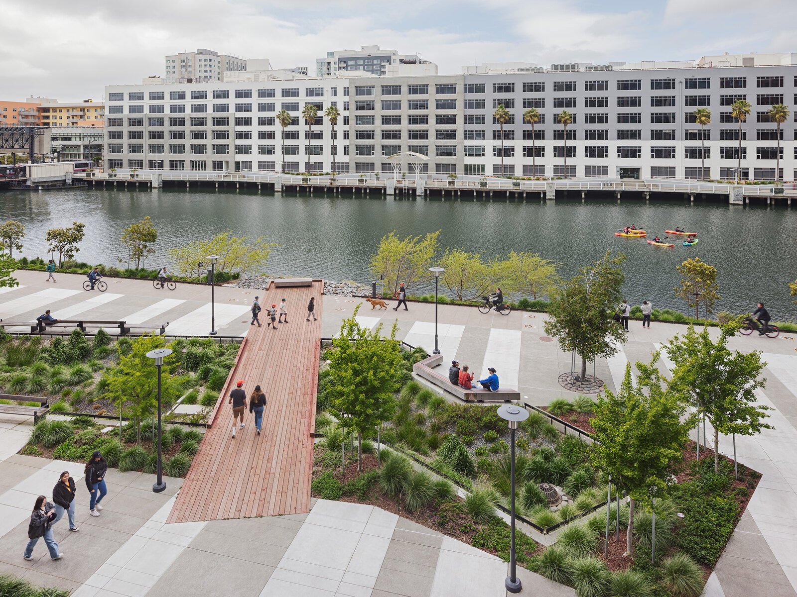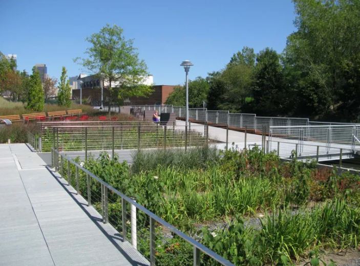 Similarly, Mission Creek Stormwater Park in San Francisco, by CMG Landscape Architecture, uses chains of bioretention planters along a waterfront promenade to treat runoff from adjacent streets before it reaches the creek. The “infrastructure” is experienced as a series of lush gardens and seating niches.