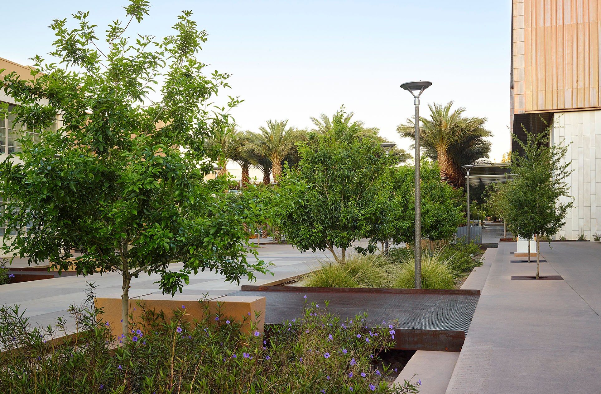 A good example is Orange Mall Green Infrastructure at Arizona State University, designed by Colwell Shelor Landscape Architecture. What was once a campus road has become a pedestrian promenade structured around a series of bioretention basins that intercept runoff from the surrounding hardscape. The basins help manage flood risk during extreme events in a desert climate while also delivering shade, social space and a strong landscape identity (Landscape Architecture Foundation, 2015).