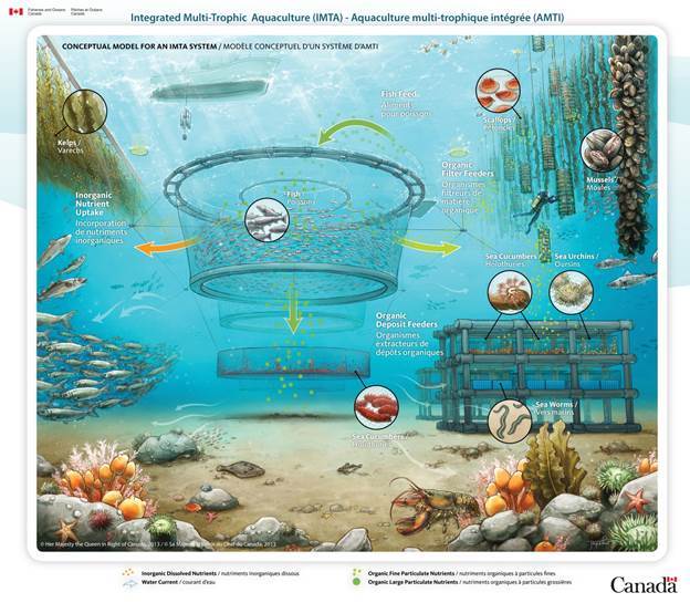 Integrated Multi-Trophic Aquaculture: Over the past decade, scientists have studied ways to improve the productivity and environmental sustainability of marine aquaculture practices. This includes examining the economic and environmental benefits of growing finfish, shellfish and marine plants together – an idea now known as integrated multi-trophic aquaculture. (Source: dfo-mpo.gc.ca)